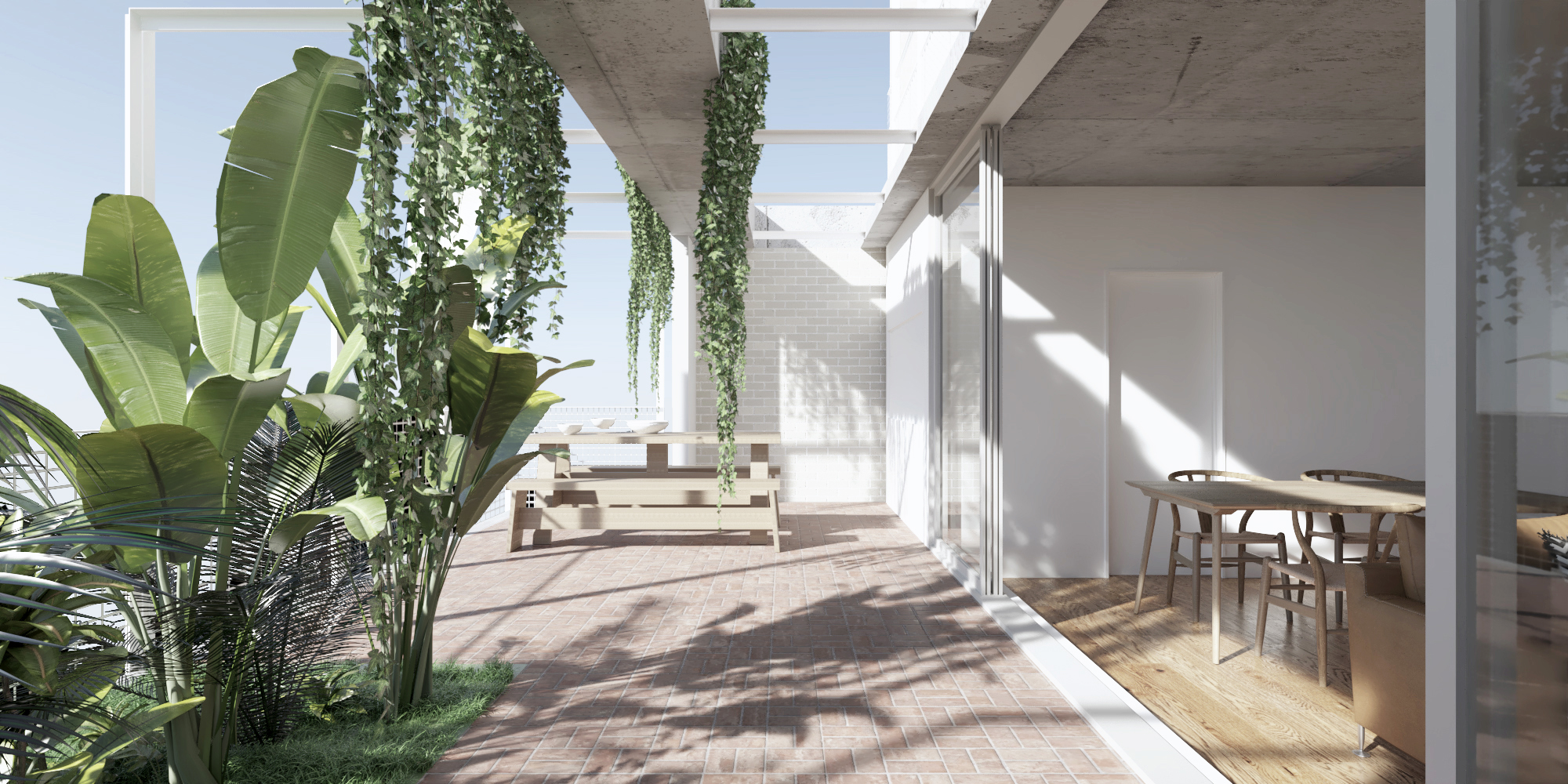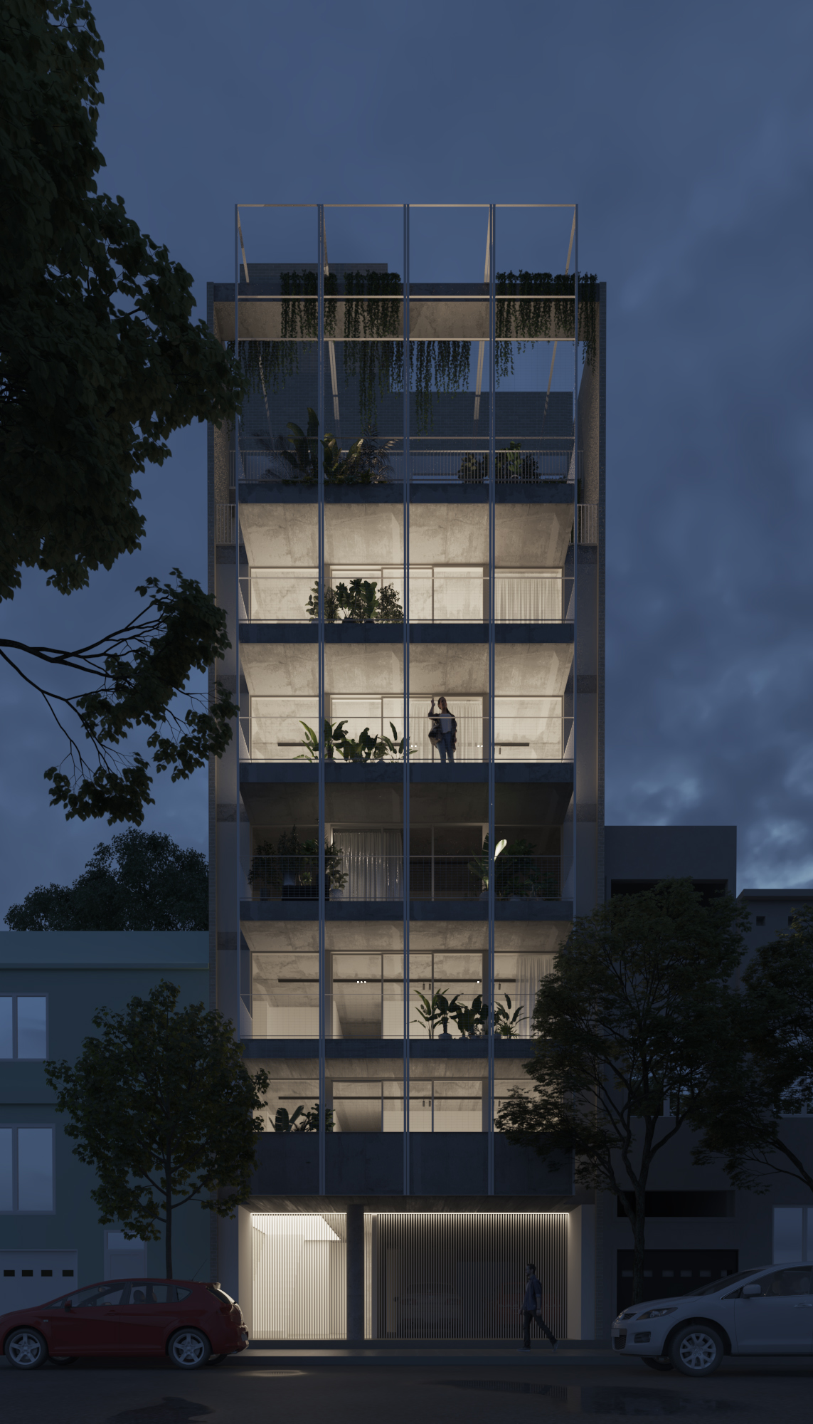 Implantado sobre una parcela con frente a una calle de tráfico moderado, tiene ingreso peatonal al hall central que permite el acceso por ascensor o escalera a los pisos superiores. El remate de este recorrido vertical es un espacio común para compartir con vistas al pulmón verde del barrio.